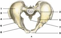 А — мужского; Б — женского: 1 — подвздошная ямка; 2 — основание крестца; 3 — подвздошный гребень; 4 — верхняя передняя подвздошная ость; 5 — седалищная ость; 6 — нижняя передняя подвздошная ость; 7 — копчик; 8 — лобковый гребень; 9 — лобковый бугорок