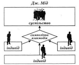 Інтерпретативні парадигми сучасної соціології Символічний До другої гілки теоретичного соціологічного знання належать інтер- інтеракціонізм претативні парадигми, скеровані на дослідження не суспільства в цілому з його структурою та функціями, а на вивчення дій окремих людей і малих груп. Серед них на чільному місці символічний інтеракціонізм (від англ. interaction — взаємодія). Ця течія визначається принциповою відмовою від дослідження макропроцесів та аналізу матеріальних фак- процес процес», або «соціальний акт», який ототожнюється з безперервною. та його зміст постійною зміною і розвитком. Змістом соціальних процесів є взаємодія індивідів у групі та суспільстві. Все інше, що існує у соціальному просторі, є наслідком соціального процесу взаємодії — і соціальний світ, тобто суспільство в цілому, і середовище соціальної діяльності, і сам індивід. Отже, індивід з'єднується з суспільством через взаємозв'язок з іншими людьми, що відображено у схемі: