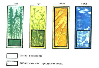 Биологическая продуктивность экосистемы отличается от запаса биомассы. Некоторые организмы в экосистеме живут много лет (деревья, крупные животные), и их биомасса переходит из года в год как некоторый капитал. На рис. показано соотношение запаса биомассы и биологической продуктивности в некоторых экосистемах.