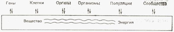 Рис. 1.1. Спектр уровней организации. Экология изучает уровни, находящиеся в правой части спектра, т. е. уровни организации от организмов до экосистем. В экологии значение термина популяция, первоначально обозначавшего группу людей, расширено и обозначает группы особей любого вида организмов. Точно так же сообщество (иногда называемое еще биотическим сообществом) в экологическом смысле включает все популяции, занимающие данный участок. Сообщество и неживая среда функционируют совместно, образуя экологическую систему, или экосистему. Сообществу и экосистеме приблизительно соответствуют часто употребляемые в европейской и русской литературе термины биоценоз и биогеоценоз (буквально жизнь и земля, функционирующие вместе). Самая крупная в смысле «самообеспечения» биологическая система которую мы знаем, — это биосфера, она включает живые организмы Земли, находящиеся во взаимодействии физической средой. Так как каждый уровень в спектре биосистемы «интегрирован», т. е. взаимосвязан с другими уровнями, здесь нельзя найти резких границ или разрывов в функциональном смысле. Их нет даже между организмом и популяцией. Например, организм, изолированный от популяции, не в состоянии жить долго, точно так же, как изолированный орган не может длительное время сохраняться как самоподдерживающаяся единица без своего организма. Подобным же образом сообщество не может существовать, если в нем не происходит круговорот веществ и в него не поступает энергия. Тот же аргумент можно привлечь для опровержения уже упоминавшегося неверного представления о том, будто бы человеческая цивилизация может существовать независимо от мира природы. По мере объединения компонентов, в более крупные функциональные единицы, у этих новых единиц возникают новые свойства, отсутствовавшие на предыдущем уровне. Таким образом рождается понятие о несводимых свойствах, (принцип эмерджентности) суть которого заключается в том, что свойства целого невозможно свести к сумме свойств его частей. Для иллюстрации проведем следующий пример: водород и кислород, соединяясь в определенном соотношении, образуют воду, жидкость, совершенно непохожую по своим свойствам на исходные газы.