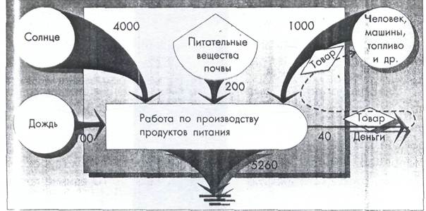 Энергия и деньгиЕще на заре цивилизации возникли деньги. Деньги - это мера стоимости товаров, созданых трудом; они являются непосредственным представителем абстрактного труда или выполненной работы. Приравненные к деньгам стоимости всех товаров приобретают одинаковое выражение и становятся сравнимы между собой. Потоки денег и энергии тесно взаимосвязаны: поток денег противоположен потоку энергии. Придадим численные значения потокам энергии, поступающим на ферму и изображенным ранее на рис. 4.2. Когда продукты питания избыточны, они превращаются в товар. После продажи товара в обратном направлении возникает поток денег (рис. 4.11).