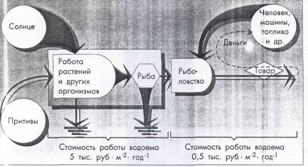 Числа на рис. 4.11 показывают количество единиц энергии, поступающей и выходящей за день в процессе жизни фермы. Каждый поток можно было бы выразить в своих единицах: удобрения - в килограммах, осадки - в сантиметрах, солнечный свет -в килокалориях 1см2, стоимость машин - в долларах (или рублях), продукцию - в килограммах и т. п. Использование общей единицы (ккал.сут1) позволяет сравнивать разные энергетические потоки. Деньги можно приблизительно выразить в единицах энергии и наоборот, поскольку стоимость товаров и услуг тесно связана с тем, сколько энергии пришлось на них затратить. Соотношение энергии и денег определяется количеством энергии, вложенной в каждый обращающийся рубль. Чем больше энергии затрачено, тем выше реальная стоимость рубля. В каждый данный момент существует некоторое среднее отношение суммы обращающихся денег к энергетическому потоку. Например, если в стране объем расходуемых денег ежегодно составляет около 1,4 трлн (1012) долларов и используется за год 35-1015 ккал энергии, то на 1 доллар приходится 25000 ккал. Естественно, это соотношение неодинаково в различных частях энергетической системы, но можно оценить его для системы в целом. Данное соотношение позволяет показать, какое количество энергии используется для поддержания деловой активности. Предположим, что некто зарабатывает и тратит 10 000 долларов в год, т.е. на поддержание жизнедеятельности этого человека затрачивается труд, эквивалентный 250 млн ккал.год-1. Его личный годовой бюджет, затрачиваемый на продукты питания, составит около 1 млн ккал. Разность между этими величинами (249 млн ккал) характеризует работу сельскохозяйственных машин,электростанций, промышленности, транспорта, природы, людей и т. т. Совокупная энергия, затрачиваемая на поддержание жизнедеятельности человека, очень велика. Но, поскольку значительная часть этой энергии скрыта от человека, он не представляет себе ее в полной мере. Оценка работы природных экосистем - ещё не решенная проблема. Деньги могут участвовать в расчетах только после того, как природные ресурсы_превращены человеком в товар, работа же природы, создающей ресурсы, при этом не оценивается. На рис. 4.12 показано, что деньги имеют отношение к рыбе только после того, как она поймана. Деньгами оцениваются только труд человека и затраты по вылову, переработке и продаже рыбы. Работа водоёма по производству рыбы обычно не оценивается деньгами. Но общая стоимость полезной работы водоема, рассчитанная посредством энергетического эквивалента долог, окажется выше стоимости собираемых в нем продуктов. Энергия и работа, выполняемая для поддержания биомассы растений и животнх в водоеме/ очистки и гювторного использования воздуха и воды, остаются вне денежной системы. Было высчитано, что если бы оценить стоимость всей полезной роботы водоема, выполняемой в течение года, в универсальной «энергетической валюте», а потом перевести в деньги, то 1 га плодородного водоема стоил бы в десятки раз больше, чем снимаемый с него годовой урожай.