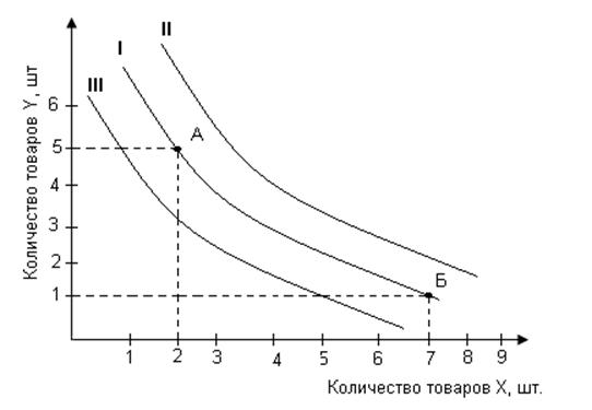 Рис. 9.1. Карта безразличия На осях координат откладывается количество товара X и товара Y, либо X и Y могут представлять целые корзины (наборы) потребительских благ. Например, точки А и Б на кривой безразличия I указывают на то, что потребителю безразлично, покупать 2 ед. товара X и 5 ед. товара Y или 7 ед. товара X и 1 ед. товара Y. Сокращение (увеличение) одного блага компенсируется увеличением (сокращением) другого. Любая кривая, лежащая выше и правее (ниже и левее) по отношению к определенной кривой, показывает более (менее) полезный набор товаров для потребителя. Конечно, если брать за исходную кривую безразличия I, то все покупатели предпочли бы остановить свой выбор на кривой безразличия II, нежели на кривой безразличия III. Это так, но это всего лишь желания, тогда как возможности определяются величиной дохода, которым располагает каждый потребитель. Здесь мы имеем дело с классами потребителей, сгруппированных по критерию уровня доходов, каждому из которых соответствует своя линия безразличия. Люди, имеющие высокие доходы, в состоянии приобретать наборы благ, имеющие большую полезность, и наоборот, потребители с низкими доходами вынуждены ограничиваться более скромными наборами. Кривая безразличия представляет такую функцию, которая указывает на неизменность величины зависимой переменной (U) при любых значениях независимых переменных (X и Y). Это означает, что дифференциал этой функции всегда равен нулю: Это означает, что дифференциал этой функции всегда равен нулю: