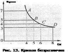 На основании данных табл. 7 построим кривую безразличия. На кривой безразличия (рис. 13) обозначены четыре равно полезные комбинации двух благ в точках А, В, С, Э. Эти комбинации дают потребителю одинаковое общее удовлетворение. Поэтому потребитель может легко поменять наборы. Следовательно, любая точка, находящаяся на кривой безразличия, создает определенные комбинации товаров в рамках бюджета потребителя с равной полезностью.