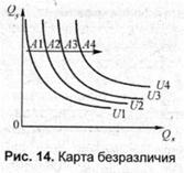Набор кривых безразличия для одного потребителя и одной пары благ образует карту безразличия. Карта безразличия — это набор кривых безразличия (рис. 14). Любая точка на кривой U4 по сравнению с U1 — U1)3 обеспечивает потребителю большую полезность. Перемещение точки из А1 в А2 => АЗ => А4 возможно только при условии определенного материального подкрепления, т.е. возможностей увеличить потребление тех или иных продуктов. На рисунке товар Y остается неизменным по количеству, но происходит увеличение в потреблении товара X. При движении условной точки А на кривых U1, U2, U3, U4 полезность останется без изменения, но будет меняться структура потребления (У < X или X < У) и увеличение спроса. Переход с U1 в U2, в U3, в U4 возможен при условии возрастания дохода или снижения цен. Для оценки возможности потребителя вводится бюджетная линия. Бюджетная линия показывает определенные возможности потребителя в различных комбинациях двух товаров, которые он может приобрести с учетом своего дохода и уровня цен на рынке (рис. 15). Совместим на одной системе координат кривые безразличия и бюджетную линию (рис. 16). Двигаясь от U1 к U2 => U3, потребитель стремится увеличить потребление и, следовательно, увеличить полезность.