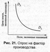 Тема 10. Спрос и предложение Цены на факторы производства устанавливаются так же, как на товары, т.е. через спрос и предложение. Спрос на факторы производства обладает определенной спецификой. 1. Спрос на ресурсы прямо пропорционален спросу на готовую продукцию, производимую с использованием данных ресурсов. 2. Спрос на все факторы производства взаимосвязан, так как они не используются по отдельности и не могут быть изолированными друг от друга в процессе применения. Рисунки 20 и 21 отображают взаимосвязи спроса готовой продукции со спросом на сырье.. Если кривая D1D1, сместится вправо (возрос спрос на хлеб), то кривая D2D2 последует за кривой D1D1и сместится также вправо. В экономике такой спрос на факторы производства называют производным спросом.