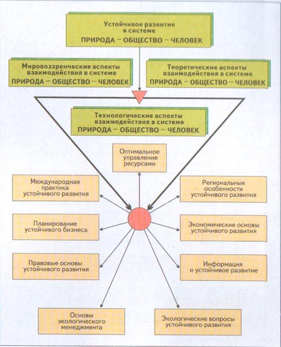 Рис. 2. Проблемний підхід до розуміння концепції сталого розвитку регіону Проблемне бачення концепції сталого розвитку в сучасному викладі змальовано на рис. 2., із якого видно, що сталий розвиток базується на «трьох китах»: СВІТОГЛЯДНОМУ, ТЕОРЕТИЧНОМУ ТА ТЕХНОЛОГІЧНОМУ (конструктивний та практичний) аспекти. У центрі проблеми сталого розвитку знаходиться оптимальне керівництво ресурсами, яке спирається на міжнародну практику та високі технології, планування сталого бізнесу та використання нормативно-правових механізмів регулювання відношень у сфері природокористування, а також на регіональні особливості сталого розвитку, його економічний та інформаційний бізнеси. Як видно, нижню частину схеми складають основи сталого розвитку регіону і включає питання сталості, ризику, екологічного оцінювання та оптимізації, також екологічного менеджменту, як засобу реалізації всих цих можливостей, які без механізмів регуляції, управління та моніторингу виявляються майже даремними. Значну роль у формуванні парадигми сталого розвитку відіграли міжнародні світові організації. Так, реакція людства на глобальну екологічну кризу знайшла відображення на конференціях по охороні оточуючого середовища: 1972 р. Стокгольм, 1992 Ріо-де-Жанейро (саме тоді і була оформлена парадигма сталого розвитку), у 2002 р. в Йоганесбурзі. Оче6видь, не випадково наступні десятиріччя (2005 - 2014) об'явлені ООН Декадою освіти за для сталого розвитку. Згідно Резолюції Генеральної Асамблеї ООН з цього питання ЮНЕСКО визначена як лідуюча світова організація, яка вирішує питання: подолання бідноти, досягення гендерної рівності, покращання охорони здоров'я та охорона оточуючого середовища. Як ви бачите охорона середовища існування людини, тварин і рослин чітко окреслена в проблемі сталого розвитку. Минуло майже 30 років з моменту освідомлення людством сучасного екологічного стану – екологічної кризи. Проаналізувавши виконанні дії людства та світового співтовариства можна сказати, що пройдений шлях до сталого розвитку, конкретні дії покращання екологічної ситуації на планеті, підвищення рівня якості людського життя мало результативні. Однак, слід відмітити, що в деякій мірі це можна пояснити, оскільки процес створення концепцій сталого розвитку тісно пов'язаний із складністю осмислення цієї проблеми та обмеженими можливостями реалізації ідей сталості. Тим не меньше вже більше 100 країн світу створили концепції сталого розвитку. На Україні також почали розробку національної концепції, яка має на меті вирішення двох стратегічних задач: забезпечення збалансованого вирішення соціально-економічних задач, а також збереження сприятливого стану оточуючого середовища та природно-ресурсного потенціалу з метою задоволення життєвих потреб нині існуючих та майбутніх поколінь. Проект концепції передбачає, що перехід України до сталого розвитку буде виконаний в три етапи, часові рамки яких не встановлені, оскільки ми знаходимось на перехідному етапі свого розвитку, зазнаючи складних економічних проблем. Крім того на 8 З'їзді УГТ були визначені актуальні та перспективні задачі геоекології та географії в цілому у контексті проблеми сталого розвитку: - вивчення особливостей формування географічної оболонки, як сфери взаємодії планетарних ендогенних, екзогенних, косміч