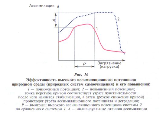 Економічна оцінка стійкості та асиміляційного потенціалу природного середовища. Будь-яка виробнича діяльність супроводжується тими чи іншими негативними змінами оточуючого середовища, суттєвими як для інших господарюючих суб'єктів, так і для населення регіону в цілому. Якщо такі наслідки не враховуються у розрахунках підприємства, то вони не пов'язані із процесом ціноутворення. Тому необхідна реалізація надринкового регулювання, що забезпечує найбільш повне врахування впливів виробництв на оточуюче середовище та відповідні компенсаційні заходи. Значення асиміляційного потенціалу і його залежність від екологічного навантаження проілюстровані малюнком.