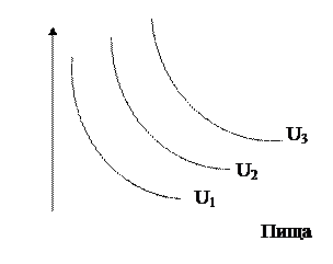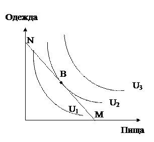 На графике представлены комбинации, обладающие равной полезностью, в виде плавной кривой. Это линия равных полезностей или кривая безразличия. Если разные комбинации дают одинаковую общую полезность, то потребителю все равно, какую выбирать. Он «безразличен» к выбору комбинаций пищи и одежды. Кривая безразличия имеет изогнутый вид в соответствии с законом замены, суть которого состоит в следующем: потребитель может согласится обменять определенное количество имеющегося у него товара на небольшое количество другого товара. По мере увеличения количества пищи и уменьшения количества одежды, он все менее охотно отдает одежду в обмен на пищу. Требует все возрастающее количество пищи за единицу одежды. По мере того, как мы получаем больше какого – либо товара, его «отношение замены» или крутизна «кривой безразличия» уменьшается. Чем дефицитнее товар, тем выше относительная стоимость его замены. Предельная полезность товара, ставшего дефицитом повышается по сравнению с предельной полезностью товара, оказавшегося в изобилии. Кривые безразличия позволяют выявить субъективную информацию о предпочтениях потребителя. Количество одного товара, от которого отказывается покупатель ради приобретения единицы другого товара, называется предельная норма замещения (MRS). MRS зависит от субъективной оценки покупателя и его желания заменить потребление одного товара другим.