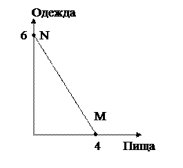 Предположим, потребитель располагает постоянным доходом 6 руб. в день. При твердых ценах 1,5 руб. за единицу пищи и 1 руб. за единицу одежды. Он может приобрести 6 единиц одежды, не покупая пищи, или 4 единицы пищи без одежды. Линия NM – это и есть бюджетная линия. Покупатель может выбрать на ней любую точку. Крутизна этой линии = 1,5: 1 или 3/2, что показывает соотношение цены пищи к цене одежды. Отказываясь от 1,5 единиц одежды (тем самым опускаясь на 1,5 деления по вертикальной оси графика) потребитель каждый раз может получать 1 единицу пищи (передвинуться на 1 деление вправо по горизонтальной оси). Бюджетную линию NM можно наложить на карту безразличия.