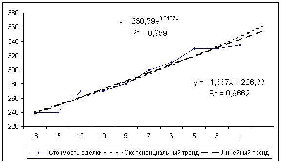 Техника построения трендов основана на описании регрессионным уравнением данных о ценах рыночных сделок с объектами-аналогами, различающимися величиной количественной характеристики только одного из ценообразующих факторов, – при наличии монотонной зависимости цены от количественной характеристики указанного фактора. Пример 23. Определить стоимость объекта недвижимости, если известно, что на местном рынке зафиксированы следующие сделки c аналогичными объектами недвижимости: