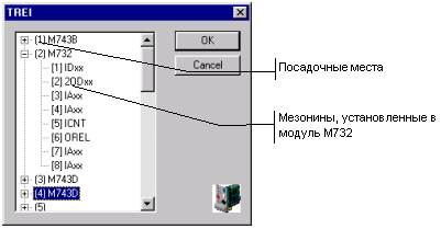 Для настройки посадочного места надо выделить его в списке и нажать ПК. При этом на экране появится диалог выбора типа модуля. Если используется модуль М732, то для настройки вставленных в него мезонинов надо открыть их список, выбрать посадочное место, нажать ПК и из списка выбрать нужный. Список мезонинов TREI, поддерживаемых ТРЕЙС МОУД, расширен. В него включены IANS/T3, IANS/T4, 2IANS/T3, 2IANS/T4, им соответствуют команды для настройки канала. Для IANS/E используется команда IANS/T4. Драйвер обеспечивает следующую обработку для IANS/T4: VALUE = RANGE * ((CIR0_CIR1) – SMIN) / (SMAX – SMIN), для IANS/T3: VALUE = RANGE * (((CIR0_CIR1) – (CIR2_CIR3)) – SMIN) / (SMAX - SMIN), где CIR0,..., CIR3 – байты данных, RANG определяется 4-ым параметром настройки GAIN/REG. Контроллеры FESTO. В диалоге настройки автопостроения данного контроллера для каждого посадочного места надо указать адрес и тип используемого модуля УСО. Вид этого диалога показан на рис. 7.