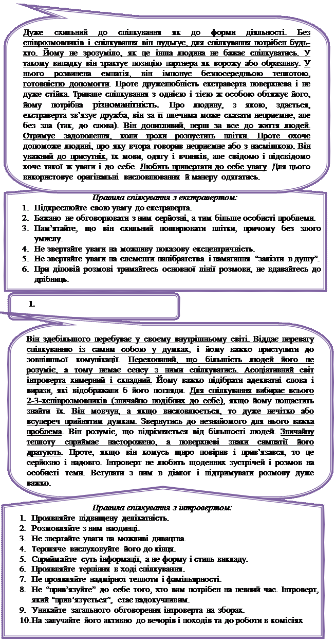 · ___________________________________________________________ який ґрунтується на принципі суворого підкорення одного співрозмовника іншому, зорієнтований на повчання, інструктаж. В наш час оновлення та демократизації суспільного життя, гуманізації стосунків для учасників взаємодії особливо неприйнятним стає такий тип спілкування, адже він пригнічує активність одного із співрозмовників, стає причиною негативного ставлення один до одного, призводить до погіршення морально-психологічного характеру стосунків. · ___________________________________________________________ спрямований на передавання певної інформації. «Інформативне» спілкування в сучасному комунікативному процесі не є достатньо ефективним, адже проста ретрансляція інформації призводить до пасивного її сприйняття, не створює умов для обміну думками, самостійного пошуку шляхів розв'язання проблем на основі наукової методології. · ___________________________________________________________ вважається справжнім показником високої культури контактів. Цей тип спілкування, характерний для демократичного стилю взаємодії, вирізняється активною співучастю кожного з учасників комунікативного процесу, вмінням партнерів проявляти вимогливість водночас із справедливістю, вмінням підтримувати розмову, слухати опонента тощо. Саме тому принципами такого типу спілкування є взаємозаміна, взаємодопомога, співробітництво й діалог. · ___________________________________________________________ який нині стає дидактично необхідним, адже схиляє до дискусії, діалогу з опонентами. Водночас тільки людина здатна виражати й закріплювати в словах і жестах зміст своїх почуттів і думок, називати ними різноманітні явища та предмети. Завдяки цьому вона створює певний комунікативний простір, в якому об'єднуються, співіснують її внутрішній, духовний світ і світ зовнішній, об'єктивний.