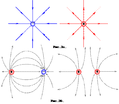 Лінії напруженості ніде не перетинаються. Вони починаються на позитивно заряджених тілах, а закінчуються на негативно заряджених (Рис.3а), тобто на оточуючих тілах, на яких виникають індукційні заряди. Силові лінії поля двох точкових зарядів – криві (Рис.3б). У випадку заряджених тіл складної форми такі розрахунки можуть бути доволі складними. Електричне поле, в якому величина і напрям напруженості однакові для будь-яких точок поля, називають однорідним. Силові лінії такого поля паралельні між собою і мають однаковий напрям. Основним завданням електростатики є саме знаходження величини і напряму вектора напруженості Якщо відомо напруженості полів, створених окремо довільною системою точкових зарядів