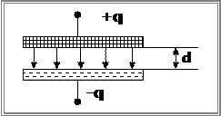 Розглянемо дві рівномірно заряджені металеві пластини, відстань поміж якими ( ) є малою порівняно з розмірами пластин (рис.8), причому обидві вони заряджені однаковим, але різнойменним зарядом, з однаковою густиною . Таку систему називають плоским конденсатором. Напруженість поля поміж пластинами конденсатора вдвічі більша від (43), оскільки є суперпозицією двох полів від двох рівномірно заряджених пластин: