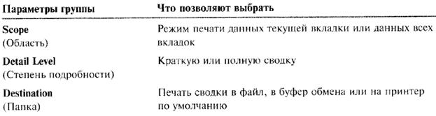 Параметры печати сводки описаны в приведенной ниже таблице.