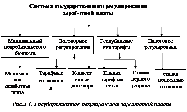 Нарастание тарифных коэффициентов ЕТС по диапазонам разрядов установлено в следующих размерах: с 1 по 4 разряд – 16%, с 4 по 6 разряд – 10%, с 6 по 23 разряд – 7%. На основе Единой тарифной сетки обеспечивается дифференциация минимальной оплаты руда в зависимости от следующих факторов: · сложности труда (квалификации) – в пределах одной профессии, должности; · содержания и характера труда у рабочих, технических исполнителей, руководителей подразделений административно-хозяйственного обслуживания, специалистов, руководителей объединений, предприятий, учреждений и организаций, функциональных и производственных подразделений; · общих условий труда, сложности выпускаемой продукции (оказание услуг), социально-бытовых условий, режимов труда и отдыха и других специфических факторов, характерных для отрасли, видов деятельности. Рассчитываемые в соответствии с Единой тарифной сеткой работников Республики Беларусь и тарифной ставкой первого разряда, устанавливаемой Правительством, республиканские тарифы оплаты труда (месячные или часовые) представляют собой гарантию оплаты труда работников соответствующей квалификации отраслей, финансируемых из бюджета и пользующихся государственными дотациями. Для работников производственных отраслей Единая тарифная сетка состоит из 23 тарифных разрядов и имеет те же соотношения тарифных коэффициентов, что и для работников бюджетной сферы. Руководители предприятий обязаны применять республиканские тарифы для дифференциации оплаты труда работников как минимальные гарантии размеров оплаты труда. Тарифно-квалификационные справочники работ и профессий рабочих представляют собой систематизированные перечни работ и профессий рабочих, имеющихся на предприятиях и в организациях. В них сформулированы необходимые квалификационные характеристики и требования, предъявляемые к рабочим, выполняющим различные по содержанию, степени сложности и профилю работы, в отношении производственных навыков, профессиональных знаний, приемов труда, умения организовать рабочее место, а также с учетом характера ответственности, лежащей на работнике за правильное выполнение работы. Тарифно-квалификационные справочники предназначены для тарификации работ и присвоения разрядов рабочим. При помощи тарифно-квалификационных справочников производится тарификация рабочих с 1-го по 8-й разряд, что позволяет оценивать сложность той или иной профессии одним и тем же измерителем — номинальной величиной разряда. Тарифно-квалификационные требования к служащим определяются исходя из Квалификационного справочника должностей служащих (КДС). Механизм регулирования заработной платы в условиях рыночных отношений должен основываться на сочетании государственного и договорного регулирования. Система регулирования оплаты труда представлена на рисунке 5.1.