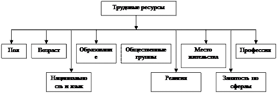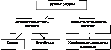 Среднегодовая численность определяется на середину года как среднее арифметическое из данных численности населения на начало и конец года или путём прибавления к начальной численности населения половины её прироста. Численность населения Украины сокращается, что вызвано уменьшением относительного числа родившихся и увеличением числа умерших. Численность, состав населения во всех станах мира определяется с помощью переписей, которые дают наиболее точные данные. Прогнозирование численности населения позволяет выявить ожидаемые изменения численности населения, оценить демографическую ситуацию в целом по стране и отдельных регионах, определить численность трудовых ресурсов, развитие их образовательного и профессионально-квалификационного уровня, проследить влияние других социально-экономических и экологических факторов на воспроизводственный процесс. Для того, чтобы определить перспективную численность населения, при составлении краткосрочного прогноза используется метод ретроспективной экстраполяции, на более долгие сроки метод передвижки по возрастам. Прогноз численности населения делается с учётом долговременных тенденций рождаемости и смертности, а также возрастно-полового состава населения. Структура формирования трудовых ресурсов. Возрастные границы и социально-экономический состав трудовых ресурсов определяются системой государственных законодательных актов. В Украине трудоспособным возрастом считается: у мужчин 16-59 лет включительно и у женщин 16-54 года. В соответствии с международной системой классификации состав трудовых ресурсов может быть представлен следующей схемой (рис.1).