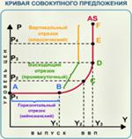 На горизонтальном отрезке кривой совокупного предложения уровень цен остается неизменным даже при увеличении объема национального производства. Это возможно в том случае, если ВВП значительно ниже потенциального объема. Такая ситуация означает, что в экономике существует значительный уровень безработицы и недогрузки производственных мощностей. При росте масштабов ВВП уровень безработицы недогрузки мощностей сокращается. Но это сокращение не ведет к росту уровня цен, бездействующие рабочая сила и оборудование вводятся в действие по существующим ценам, и издержки производства при этом не изменяются.