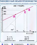 Проблема равновесия в национальной экономике уже рассматривалась ранее в теме 7, когда речь шла о макроэкономической модели "совокупный спрос - совокупное предложение" (модель AD-AS). Равновесию в экономике соответствует равновесный объем национального производства (или совокупное предложение), равновесный уровень совокупных расходов (или совокупный спрос) и равновесный уровень цен. Равновесие в экономике означает, что внутренний рынок товаров и услуг находится в состоянии, когда объем национального производства (или совокупное предложение) при данном уровне цен равен совокупным расходам (или совокупному спросу). Состояние равновесия является важным понятием в экономической теории. Это своеобразная точка отсчета для анализа изменений в совокупном спросе и совокупном предложении. В этом состоянии нет явно выраженной тенденции в сторону увеличения или уменьшения ВВП (GDP) или дохода. В принципе равновесный объем производства выявляется при сопоставлении объема выпуска продукции и совокупных расходов. Равновесный объем производства (выпуска) - это такой объем производства, при котором совокупное предложение равно совокупному спросу, или это объем производства, обеспечивающий расходы, достаточные для закупки данного объема производства. AS (GDP) = Y = AD. При рассмотрении модели "совокупный спрос - совокупное предложение" (модель AD-AS) равновесный объем производства графически определялся в точке пересечения кривых совокупного спроса и совокупного предложения. В рассматриваемой нами стандартной кейнсианской модели совокупного спроса цены предполагаются неизменными, поэтому нет необходимости включать их в график равновесного выпуска продукции.