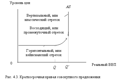 Неценовые факторы совокупного спроса. На рисунке 4.2. показано, что увеличение совокупного спроса смещает кривую вправо от АD1 к AD2. Этот сдвиг показывает, что при одном и том же уровне цен желаемый объем товаров и услуг возрастет. И наоборот, уменьшение совокупного спроса показано как сдвиг кривой влево от AD1 к AD3. Существует четыре сектора экономики, которые осуществляют расходы и выкупают совокупный объем производства, они и влияют на изменения в его объеме. 1. Потребительские расходы. К факторам, изменяющим характер потребительских расходов относятся: 1) благосостояние потребителя; 2) ожидания потребителя; 3) задолженность потребителя; 4) налоги. 2. Инвестиции. Неценовые факторы, изменяющие характер инвестиционных расходов: 1) процентная ставка; 2) ожидаемые прибыли от инвестиций; 3) налоги с предприятий; 3) технология; 4) избыточные мощности. 3. Государственные расходы. Увеличение государственных расходов (например, на военные нужды или на строительство общественных объектов) при данном уровне цен будет приводить к возрастанию совокупного спроса. 4. Чистый экспорт. Неценовыми факторами являются национальный доход зарубежных стран и валютные курсы. Совокупное предложение Совокупное предложение определяется количеством материальных благ и услуг, которое предприниматели предлагают на рынке. Кривая совокупного предложения Кривая совокупного предложения - это модель, которая показывает уровень реального объема производства при каждом возможном уровне цен. Высокие уровни цен стимулируют производство товаров, более низкие – его сокращение. Поэтому зависимость между уровнем цен и объемом национального продукта является прямой, или положительной. Кривая совокупного предложения в краткосрочном периоде состоит из трех отрезков: 1) кейнсианского (горизонтального), 2) промежуточного (отклоняющегося вверх), и 3) классического (вертикального) отрезков. Кейнсианский (горизонтальный) отрезок. Уровень производства Q’ на рисунке 4.3. обозначает потенциальный ВВП при полной занятости и естественном уровне безработицы. Горизонтальный же отрезок означает значительно меньший объем внутреннего производства. Следовательно, он свидетельствует о том, что экономика находится в состоянии глубокого спада, недоиспользованных производственных мощностей и рабочей силы. Эти неиспользуемые ресурсы можно привести в действие, не оказывая воздействия на уровень цен.