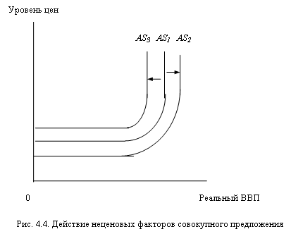 Классический (вертикальный) отрезок. Экономика, находясь в точке Q’ своих производственных возможностей, за короткий срок не может достичь дальнейшего увеличения производства. При полной занятости одна фирма может за счет других попытаться расширить свое производство путем увеличения зарплаты и назначения более высокой цены за ресурсы. При этом другая фирма потеряет рабочих и сократит объем производства. В результате в экономике цены на товары увеличатся, а реальный объем производства останется неизменным. Промежуточный (восходящий) отрезок. На промежуточном отрезке между Q и Q’ увеличение реального объема производства сопровождается ростом уровня цен. Одна из причин заключается в том, что полная занятость возникает неравномерно и не одновременно во всех отраслях экономики. Неценовые факторы совокупного предложения. Действие неценовых факторов приводят к смещению кривой совокупного предложения (см. рис.4.4.). Действие ценовых факторов связано с изменением издержек на единицу продукции. В свою очередь, на издержки предприятий влияют следующие факторы: цены на ресурсы, производительность труда; государственное регулирование деятельности предприятий.