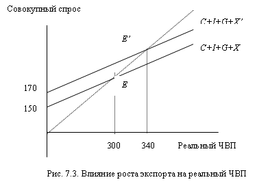 Например, при с = 0,75; t = 0,2 и х = 0 мультипликатор будет равен 4, а при х = 0,1 величина мультипликатора составит лишь 2. При росте экспорта изменяется равновесный уровень доходов. Рост экспорта оказывает точно такое же влияние, как и рост G или I. А именно: рост экспорта увеличивает объем выпуска продукции внутри страны, а значит и уровень доходов на сумму, равную произведению мультипликатора и данного прироста чистого экспорта: ΔY= ke ΔXn. Так, на рисунке7.3. показано, что если чистый экспорт увеличился на 20 млрд. руб., то равновесный уровень доходов увеличивается с Е до Е'. При мультипликаторе, равном 2, уровень доходов возрастет с 300 до 340 млрд. руб.
