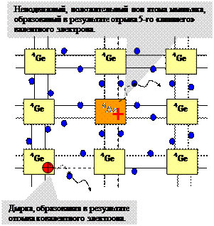 Электропроводность полупроводников может быть существенно увеличена путём добавления незначительного количества примесей. Так на электропроводность таких полупроводников, как германий и кремний особенно большое влияние оказывают примеси трёхвалентных элементов алюминия, бора, галлия, индия, а также пятивалентные примеси фосфора, мышьяка, сурьмы. Если в идеальный кристалл полупроводника ввести примесь пятивалентного мышьяка, то его атомы замещают атомы основного вещества в узлах кристаллической решётки. При этом четыре валентных электрона атома мышьяка вступят в связь с четырьмя электронами соседних атомов германия. Пятый электрон в связи не участвует и поэтому слабо связан со своим материнским атомом. При температуре отличной от нуля он оторван от ядра и может свободно перемещаться в узлах кристаллической решётки. Энергия ионизации такого атома равна всего лишь ΔWион. = 0,012 эв.