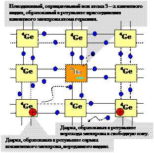 Введём теперь в германий примесь трёхвалентного индия. В ковалентной связи будут участвовать только три валентных электрона индия, а связь с четвёртым соседним атомом германия будет неукомплектована (вакантна). Вакантное место может быть занято электроном из соседних атомов, где при этом образуется дырка. Атом индия окажется ионизированным отрицательно. Изменяя концентрацию вводимых примесей, можно в широких пределах регулировать концентрацию дырок, образующихся при этом. В таком полупроводнике концентрация дырок будет значительно преобладать над концентрацией электронов обусловленных термогенерацией пар электрон-дырка собственного полупроводника. Следовательно ток в таком примесном полупроводнике будет в основном обусловлен дырками. Примеси обусловливающие дырочную проводимость называются акцепторными, а сам полупроводник называется дырочным или полупроводником p - типа. Энергетические уровни атомов акцепторов в p полупроводнике расположены вблизи потолка валентной зоны и при температуре отличной от нуля они полностью заняты электронами валентной зоны на энергетических уровнях которой образуются дырки. Образовавшиеся дырки, концентрация которых на несколько порядков превышает концентрацию носителей заряда в собственном полупроводнике, обусловливают в основном дырочную проводимость такого полупроводника.