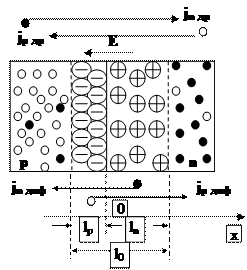 По мере увеличения объёмного заряда, а следовательно и напряжённости поля E, диффузионный ток уменьшается, а дрейфовый ток возрастает. Этот процесс продолжается до тех пор, пока лишь незначительная часть основных носителей заряда, имеющих энергию, достаточно большую, для преодоления тормозящего действия поля, сможет перемещаться(прорываться) через границу раздела. Когда диффузионный ток таких носителей заряда уравновесится, растущим по мере увеличения объёмного заряда, током неосновных носителей заряда, наступает состояние динамического равновесия. В этом состоянии токи в смежные области полупроводников уравновешивают друг друга, объёмный заряд перестаёт расти, суммарный ток через границу раздела равен нулю, т.к. внешняя цепь разомкнута. Итак: jp др + jn др + jp диф + jn диф = 0.
