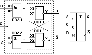 При С=0 на входах R, S асинхронного триггера на элементах DD1.1 и DD1.2 действуют сигналы логического нуля, поэтому при любых комбинациях сигналов на входах R, S синхронного RS-триггера состояние триггера не меняется. При С=1 рассмотренный синхронный RS-триггер работает точно так же, как рассмотренный чуть раньше асинхронный RS-триггер с прямыми входами. Статический вход не теряет своего управляющего действия, пока на нем присутствует тактовый (синхро) импульс