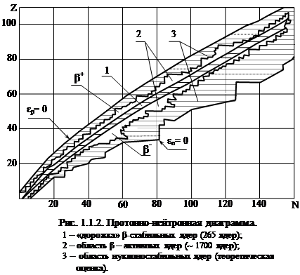 5. Большинство химических элементов имеетпо несколько стабильных иb-активных нуклидов. Некоторые элементы имеют (см. рис.1.1.1) всего по одному стабильному нуклиду (9Be, 19F, 23Na), остальные - по 2 - 3 стабильных нуклидов. Олово (Sn) имеет десять стабильных нуклидов. 6. Выше дорожки стабильности располагаются β+‑активные нуклиды, ниже – 7. Свойства ядер существенно зависят от четности чисел Z и N. Наибольшее число стабильных нуклидов (155 из 265) имеют четно-четные ядра (Z – четно, N – четно), поровну стабильных нуклидов (по 53) с четно-нечетным и нечетно-четным количеством нуклонов в составе ядер. И имеется всего четыре стабильных нуклида (2Н, 6Li, 10В и 14N), имеющих нечетно-нечетный состав ядер.