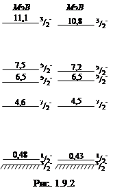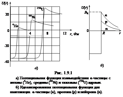 где Z – заряд ядра, z - заряд налетающей частицы. На расстоянии от ядра, где начинает проявляться действие ядерных силы притяжения, потенциальная энергия круто падает на расстояниях ~ 10-13 см, что соответствует большой интенсивности ядерных сил (сила пропорциональна антиградиенту потенциальной энергии dU/dr). Внутри ядра потенциальная энергия отрицательна (см. рис. 1.4.1) и представлена некоторой средней величиной (дно потенциальной ямы). На рисунке 1.9.1 а пунктиром показаны также удельные энергии связи рассматриваемых ядер. Радиусы ядер на этом же рисунке подсчитаны по формуле (1.5.2). Энергия ядерного взаимодействия на рисунке 1.9.1 а характеризует только центрально-симметричную часть ядерных сил и не учитывает зависимость ядерных сил от спина (см. ниже п.4) и нецентральный характер ядерных сил (см. ниже п.7).