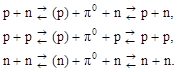 нуклон оказывается окруженным облаком виртуальных π-мезонов, которые образуют поле ядерных сил. Поглощение этих пионов другими нуклонами приводит к сильному взаимодействию между нуклонами и происходит по одной из следующих схем: