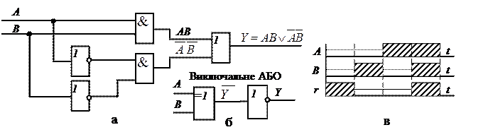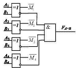 Схему порівняння двох чотирирозрядних слів А і В згідно з виразом показано на рис. 3.16. Схема містить чотири логічних елементи "Виключальне АБО” і один елемент “І”.
