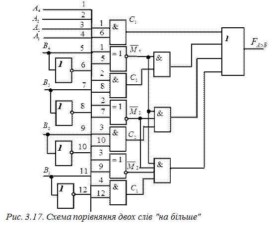 Згідно співвідношенню (3.19) показана схема порівняння "на більше" двох чотирирозрядних слів А і В на рис. 3.17. На схемі використана шина, в якій виводи ліворуч відповідають виводам праворуч.