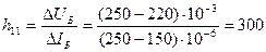 Для визначення коефіцієнта h21 користуються вихідними характеристиками. Вважаючи UК=const (наприклад, 10 В) і надаючи приросту струму ΔІБ (наприклад, від 250 до 300 мкА), знаходимо відповідний приріст струму колектора ΔІК (від 62 до 72 мА) і розраховуємо коефіцієнт