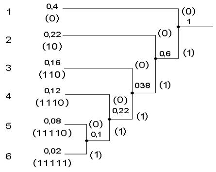 Таким чином, ми одержали стиснення в співвідношенні 1:1,429, що дуже непогане. І наприкінці, вирішимо останню задачу: дешифровка послідовності бітів. Хай для нашої ситуації є послідовність бітів: 001101100001110001000111111. Необхідно визначити початковий код, тобто декодувати цю послідовність. Звичайно, в такій ситуації можна скористатися таблицею кодів, але це достатньо незручно, оскільки довжина кодових символів непостійна. Набагато зручніше здійснити спуск по дереву (починаючи з коріння) за наступним правилом: 1. Початкова точка – корінь дерева. 2. Прочитати новий біт. Якщо він нуль, то пройти по гілці, поміченій нулем, інакше - одиницею. 3. Якщо точка, в яку ми потрапили, кінцева, то ми визначили кодовий символ, який слідує записати і повернутися до пункту 1. Інакше слід повторити пункт 2. Розглянемо приклад декодування першого символу. Ми знаходимося в точці з імовірністю 1,00 (коріння дерева), прочитуємо перший біт послідовності і відправляємося по гілці, поміченій нулем, в точку з імовірністю 0,60. Оскільки ця точка не є кінцевою в дереві, то прочитуємо наступний біт, який теж рівний нулю, і відправляємося по гілці, поміченій нулем, в точку Таким чином декодована послідовність приймає вигляд.