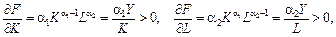 де індекс t = 1, …, T показує момент часу (або номер спостереження) за факторами виробництва та випуском. Тоді невідомі параметри можна знайти методом найменших квадратів (МНК) за допомогою стандартних пакетів прикладних програм (наприклад, MS Excel, Eviews, SAS тощо). Можна легко переконатись, що мультиплікативні ВФ задовольняють перші дві умови для неокласичних функцій. Справді,