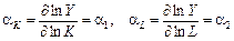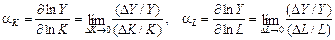 оскільки a1 > 0, a2 > 0. Частинні похідні випуску за факторами — так звані граничні продукти, або граничні ефективності, факторів — відповідають приросту випуску на одиницю приросту фактора. Неважко переконатись, що мультиплікативна ВФ задовольняє також умови 3 і 4 для неокласичних ВФ. Подамо економічну інтерпретацію параметрів a1 > 0, a2 > 0. Для цього введемо поняття еластичностей як логарифмічних похідних факторів за випуском: