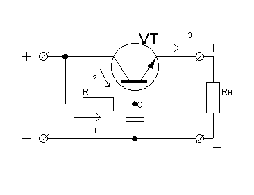 больше второго, то будет перекомпенсация напряжения, а если меньше то недокомпенсация. Достигнуть полной компенсаци при изменении входного напряжения из-за нестабильности параметров транзистора практически невозможно.Поэтому достижимый коэффициент сглаживания таких фильтров значительно меньше теоретического. В фильтрах типа ФП через транзистор протекает постоянный ток, значительно меньше по величине тока нагрузки, поэтому часто можно обходится транзисторами без теплоотводов. Данные фильтры не боятся коротких замыканий, но при снятии нагрузки транзистор может перегружаться. В связи с тем, что часть выпрямленного напряжения падает на последовательном включенном транзисторе, а в параллельно включенном транзисторе для своей работы потребляет часть выпрямленного тока, то КПД фильтра ФП составляет порядка 40…60%.
