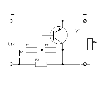 Принцип работы. Переменная составляющая входного напряжения протекает по следующим путям. Первый путь – это фильтрирующее звено RС, через которое переменная составляющая попадает на базу тарнзистора VT. Второй путь- через коллекторное сопротивление и конденсатор С. Третий путь – это через эмиттерное сопротивление к нагрузке. Поскольку всегда выполняется условие (h11э) << Rн, 1/wп·C < (h11э), (2.37)