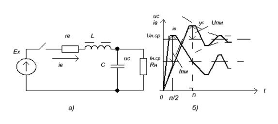 Рисунок 2.39 – Эквивалентная схема и графики напряжения и тока в фильтре LC- при включении выпрямителя