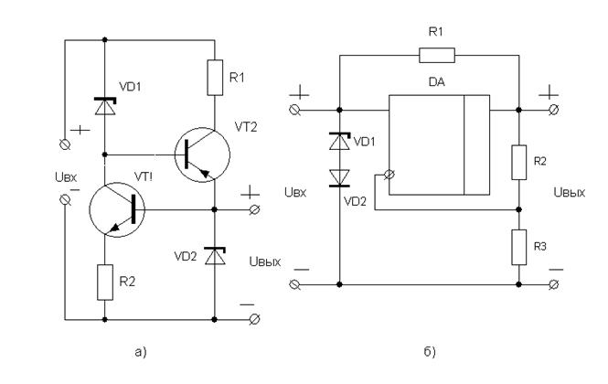 Рисунок 2.41 - Схемы двухкаскадного параметрического стабилизатора (а), мостового стабилизатора (б), схема температурной стабилизации (в) и схема однокаскадного параметрического стабилизатора Мостовой параметрический стабилизатор приведен на рисунке 2.41,б. В этой схеме используется принцип компенсации изменения напряжения стабилизации стабилитрона за счет противоположного изменения напряжения на компенсирующем резисторе Rd. В таком стабилизаторе выходное напряжение равно разности напряжения стабилизации стабилитрона VD и падения напряжения на резисторе Rd. При увеличении напряжения Uвх увеличивается напряжение на стабилитроне VD. Одновременно с этим увеличивается напряжение на резисторе Rd. Если величина резистора Rd подобрана таким образом, чтобы увеличение напряжения на стабилитроне равно увеличению напряжения на резисторе Rd, то выходное напряжение Uвых почти не изменяется. Для этого необходимо выполнить условие rст/Rг1=Rd/Rг2. На практике, однако, удается увеличить Кст не более чем в пять раз по сравнению с однокаскадным стабилизатором. К недостаткам мостового стабилизатора следует отнести увеличенное выходное сопротивление. Температурная стабилизация параметрических схем может выполняться посредством компенсации ТКН, как показано на рисунке 2.41,в. Так как стабилитроны с напряжением стабилизации больше 6 В имеют положительный температурный коэффициент напряжения около 4мВ/ °С, а диоды при прямом включении имеют отрицательный температурный коэффициент напряжения