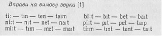1.10.Фонема [t] — передньоязичний альвеолярно-апікальний шумний проривний приголосний звук. Англійський звук [t] значно відрізняється від українського [т]. При вимовлянні англійського [t] кінчик язика міцно притискується до альвеол (апікальна артикуляція), утворюючи повну перепону, а потім сильний поштовх повітря відриває його від альвеол, внаслідок чого звук [t]; дістає сильний придих (аспірацію), особливо в кінці слів і перед довгими наголошеними голосними. Український звук [т] вимовляється при дорсальній артикуляції (передня спинка язика торкається верхніх зубів) і без придиху. Потренуйтесь у вимовлянні англійського звука [t], дотримуючись характерних для нього рис.