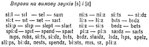 1.12.Фонеми [s] і [z] — передньоязичні альвеолярно-апікальні круглощілинні шумні приголосні звуки: [s ] — глухий, [z] — дзвінкий. При вимовлянні англійських звуків [s] і [z] кінчик язика піднімається до альвеол і разом з ними утворює круглий прохід для повітря (звідси і назва — круглощілинні). При вимовлянні українських звуків [с] і [з] щілину утворюють кінчик язика і передні верхні зуби (дорсальна артикуляція), тому вони більш свистячі, мають світліший відтінок порівняно з англійськими [s] і [z]. Як і всі англійські дзвінкі приголосні, [z] ніколи не оглушується.