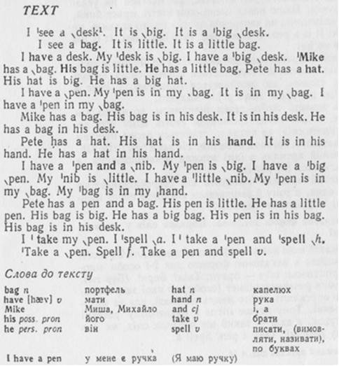 Пояснення до тексту з граматики 2.09.Відмінювання дієслова have у теперішньому неозначеному часі. Дієслово have у третій особі однини теперішнього (неозначеного) часу має форму has. В інших особах однини й множини вживається форма have. Речення з дієсловом have (мати) перекладаються так: I have a bag.— Я маю портфель, або У мене є портфель. Не has a bag.— Він має портфель, або У нього є портфель.