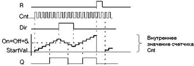 Реверсивный счетчик. Функция считает число изменений состояния входа Cnt из «0» в «1», обратный переход не учитывается. Для быстрых счетчиков используются входы I 3, I 4, I 5 и I 6 (только LOGO! 12/24 RC/RCo и LOGO! 24/24o), при этом максимальная частота следования импульсов равна 5 кГц. Другие входы обеспечивают типовое значение 4 Гц. Направление счета задается сигналом на входе Dir. Устанавливается порог включения (параметр «On») и порог отключения (параметр «Off»), диапазон значений от 0 до 999999. Начальное значение, от которого начинается прямой или обратный счет задается параметром «StartVal». Выход Q устанавливается или сбрасывается в зависимости от текущего значения Cnt и заданных пороговых значений. Сигнал на входе R сбрасывает внутреннее значение счетчика в 0. Временная диаграмма работы счетчика показана на рис. 5.15.
