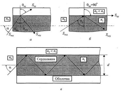 Рис. 5.12. Схема распределения и траектория распространения оптического сигнала в световоде ломления. На рис. 5.12, а электромагнитная волна Sпад, падая на границу двух диэлектрических сред под углом Θпад, частично отражается (Sотр) от границы раздела под углом Θпад и частично преломляется (Snp) под углом Θпр. При этом соблюдается соотношение n 1sinΘпад = п2 sinΘпр, где n 1, п2 — коэффициенты преломления соответственно сердцевины и оболочки. С увеличением угла Θпад возрастает угол Θпр и при Θпад = Θ0 становится равным 99°, а преломленный световой сигнал скользит вдоль границы раздела сред (см. рис. 5.12, б). При всех значениях Θпад > Θ0 преломленная волна будет отсутствовать. Угол Θ0 = arcsin(n1 / п2), при котором световая энергия зигзагообразно распространяется по сердцевине световода (рис. 5.12, в), называют углом полного внутреннего отражения. Угол полного внутреннего отражения определяет условие падения светового сигнала на торец световода. Если на торец световода из окружающей среды с коэффициентом преломления п0 падает сигнал под углом а с коэффициентом преломления п1 к оси сердцевины, то при определенном угле падения α = arcsin(—cosΘmax) сигнал будет полностью отражаться от границы раздела сред сердцевина—среда. Для воздушной среды (n0= 1) получим sinamax =