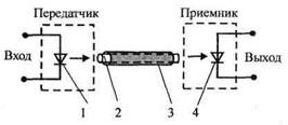 где λкр fкр — критическая длина волны и частота передаваемого по световоду сигнала; с — скорость света. При λкр имеет место режим стоячей волны, когда энергия рассеивается в окружающее пространство и по световоду не передается. При частотах выше критических энергия поля концентрируется внутри сердцевины и эффективно передается по световоду. Таким образом, в световоде могут лишь распространяться сигналы с длиной волны λ<d, а световоды ведут себя как высокочастотные фильтры. В волоконно-оптической ЛП (рис. 5.14) оптическая энергия от свето-диода 1 за счет полного внутреннего отражения передается по сердцевине 2